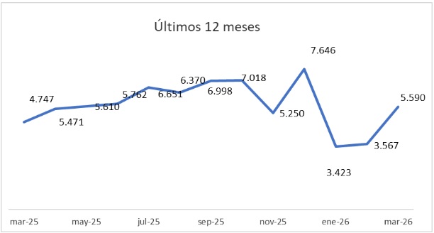 El salto es aún más evidente si se analiza la evolución mensual inmediata: respecto a febrero de 2026, mes que registró 3.567 operaciones, la actividad escaló un 56,7%.
